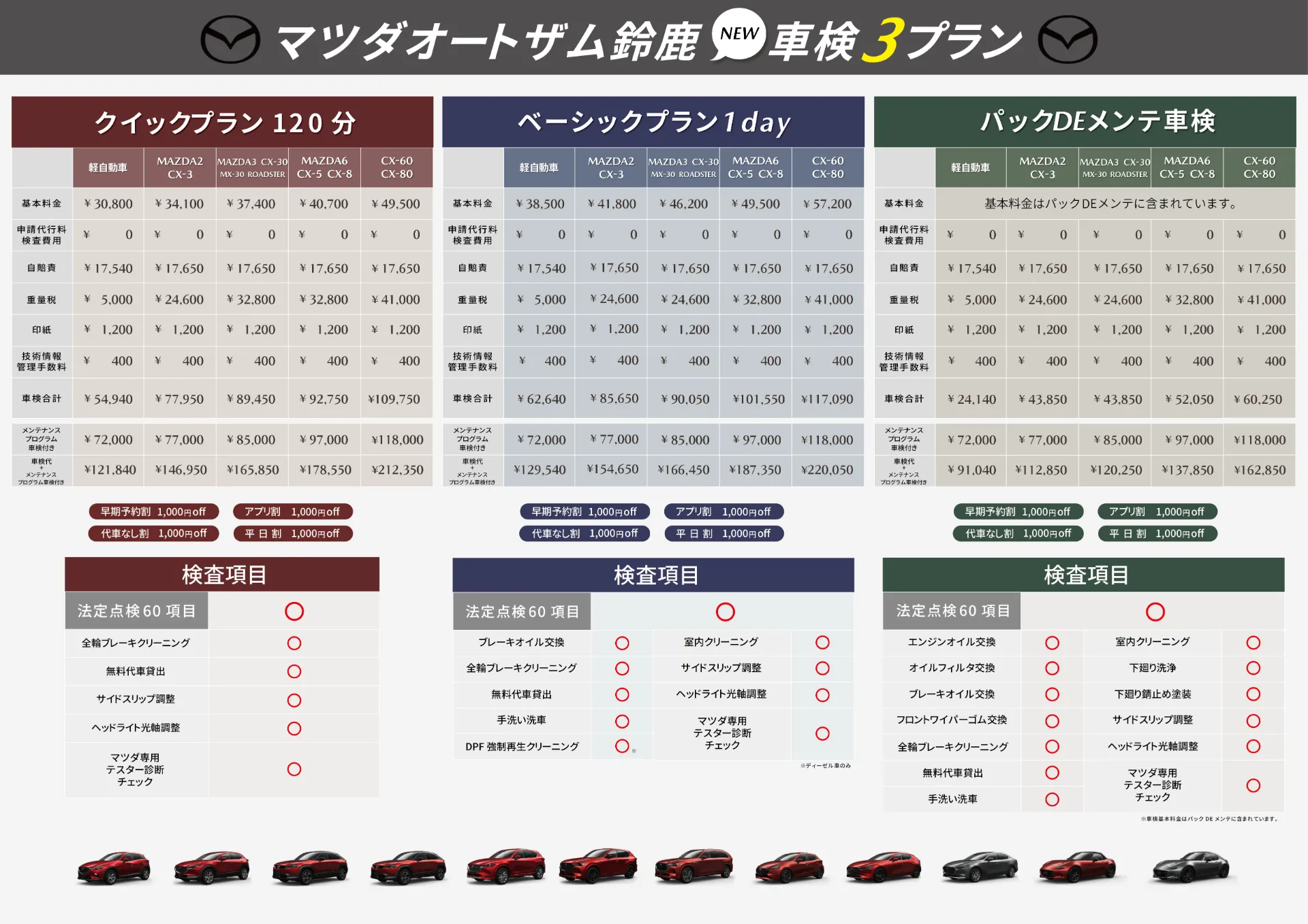 軽自動車 フレア/ワゴンなど | 小型自動車 MAZDA2/ロードスターなど | 中型自動車 MAZDA3/CXー30など | 大型自動車 CXー5/CXー8など | 超大型自動車 CXー60/CXー80など | |
